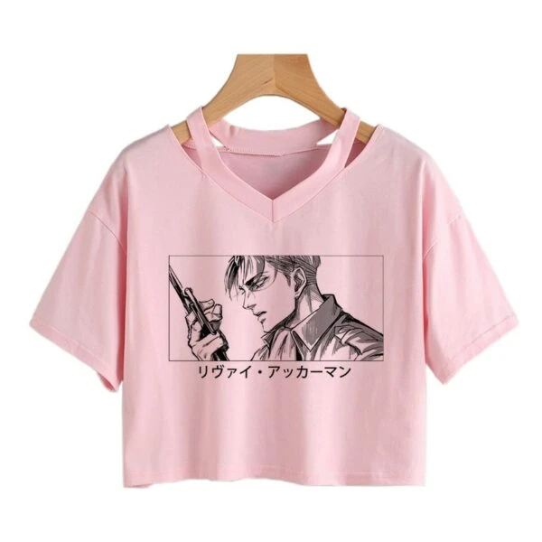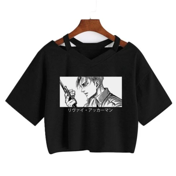Le crop top Grappin de Livaï représente Livaï de profil, qui tient la gâchette du grappin qui lui sert à se projeter en hauteur, en déclenchant du gaz comprimé pour accélérer ses mouvements. Son nom リヴァイ・アッカーマン est écrit en japonais sous l’image.