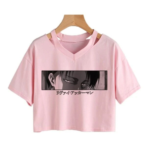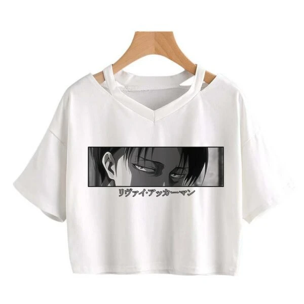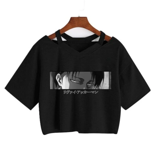Le crop top I’m watching you N&B représente Livaï Ackerman en noir et blanc, qui jette un regard qui semble lire nos pensées.