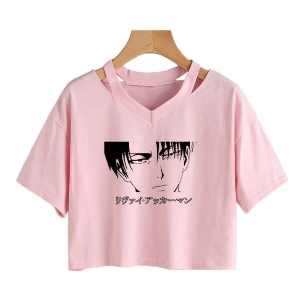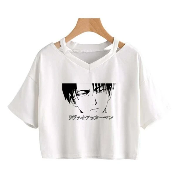 Le crop top Livaï Ackerman N&B représente le visage de Livaï en noir et blanc. Sous l’image on peut lire リヴァイ・アッカーマン qui signifie Livaï Ackerman en japonais.