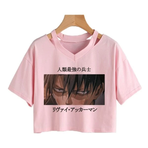 Le crop top Livaï en colère représente Livaï en couleur, jetant un regard froid et déterminé. Sous l’image est écrit son nom en japonais :リヴァイ・アッカーマン.