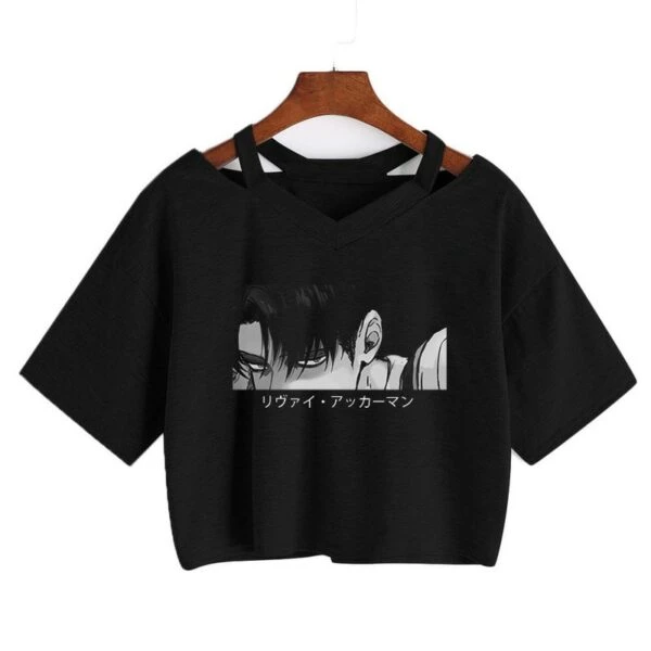 Le crop top Livaï mystérieux représente le caporal-chef Livaï Ackerman en noir et blanc. Son nom en japonais リヴァイ・アッカーマン est écrit sous l’image.