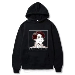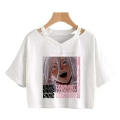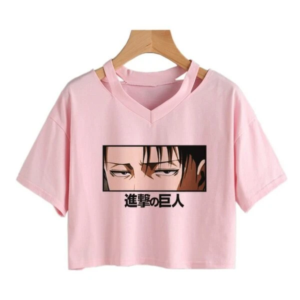 Le crop top Shingeki no Kyojin met en avant Livaï Ackerman. On le reconnait facilement à son regard froid. Sous l’image est écrit Shingeki no Kyojin en japonais, qui veut dire l’Attaque des Titans.