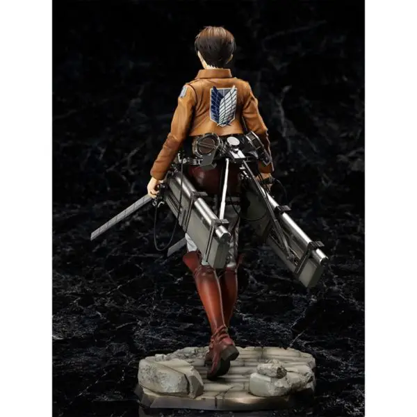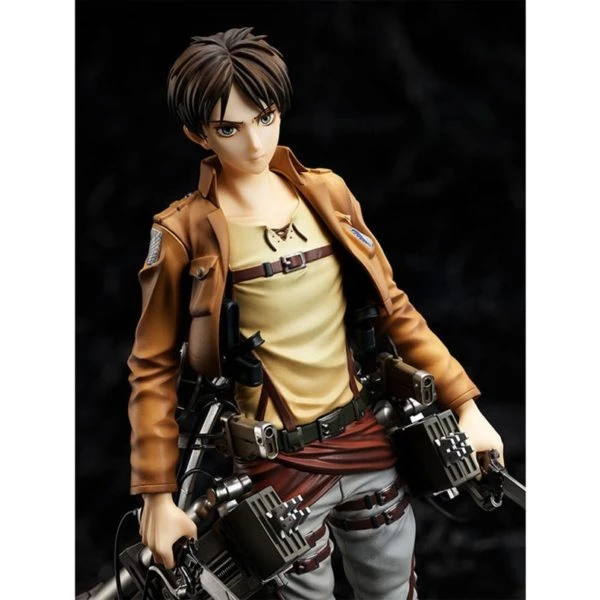 Reproduit avec une grande finesse de détail, Eren est vêtu de sa tenu de soldat. Il porte ses épées à la main et son équipement de manœuvre tridimensionnel autour de la taille.