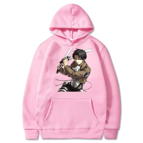 Ce sweat à capuche en coton Livaï et ses sabres représente le caporal Livaï Ackerman en tenue de combat, tenant ses sabres à la main. Sa position d’attaque laisse penser qu’il s’apprête à trancher la nuque d’un Titan lors de l’une des nombreuses expéditions en dehors des murs qu’il a pu faire.