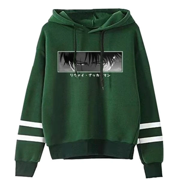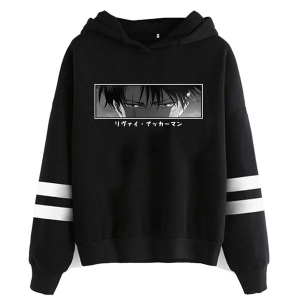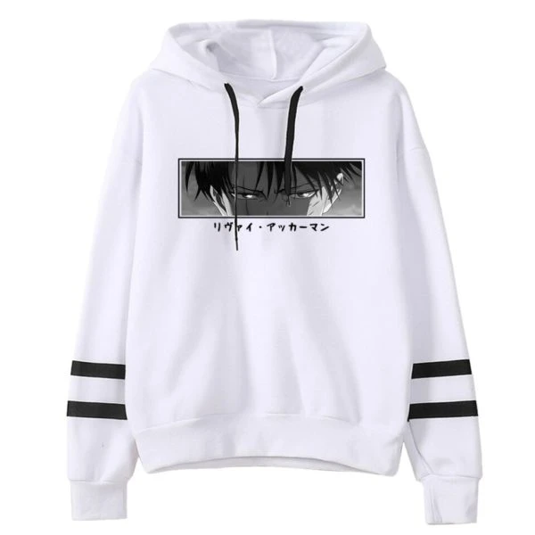 Ce sweat à capuche en coton Regard Livaï rayures montre un Livaï plus determiné que jamais. Contrairement au , il est facile de placer cette image dans l’espace temps de l’histoire de SNK grâce à la cicatrice qui parcours son visage, vestige du combat avec Sieg Jäger dans la chapitre 114 du manga.