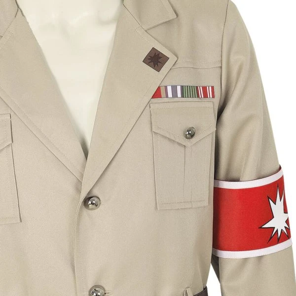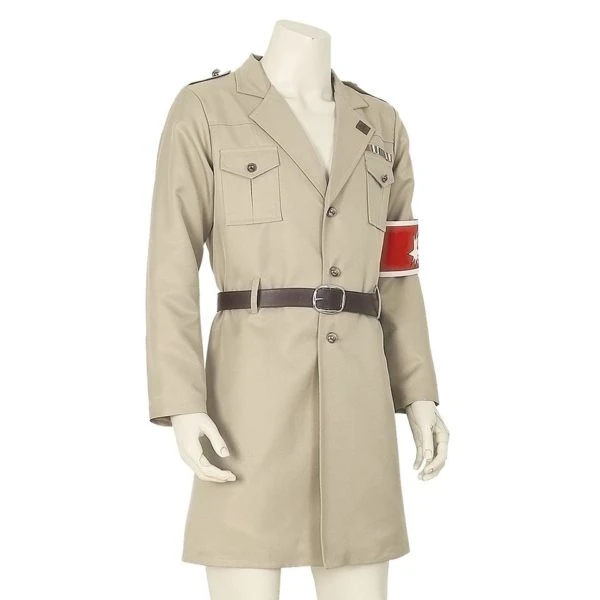Le trench est vendu avec une ceinture et un brassard rouge, signe distinctif de l’Unité des Guerriers. Deux poches avant, des épaulettes et des boutons ronds argentés agrémentent la veste pour copier au mieux la veste de Reiner. On retrouve l’étoile à 9 branches qui distingue les Eldiens cousus sur le revers du col, ainsi que des décorations militaires au-dessus de la poche gauche.