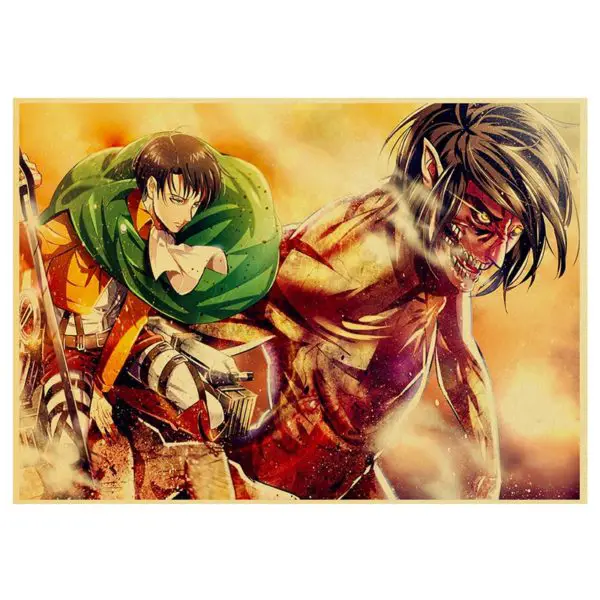 L’affiche Livaï et le Titan Assaillant imprimée sur du papier de haute qualité décorera parfaitement ta chambre. Disponible au format A4 ou au format A3, le poster a une petite bordure et adopte un effet rétro avec son papier kraft volontairement jauni.