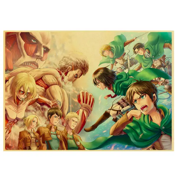 Le poster présente d’un côté les 3 titans métamorphes infiltrés à Paradis : Annie, Bertolt et Reiner, avec leur titans respectifs au dessus d’eux. Face à eux se trouvent Eren, Mikasa, Armin et Livaï, leur au vent, en train de charger.