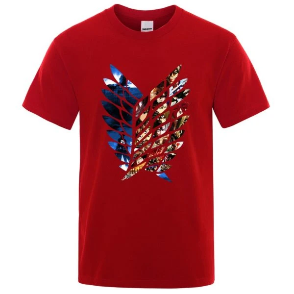 L’image représente les ailes de la liberté. À l’intérieur de chaque plume, un dessin est visible. D’un côté Eren contemple le mur en flamme avec le Titan Colossal derrière. Il s’agit du de SNK. De l’autre côté, on aperçoit les principaux héros de l’histoire.