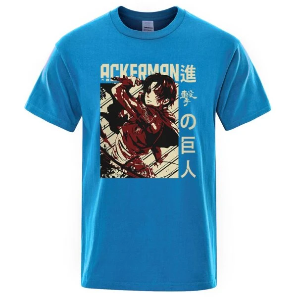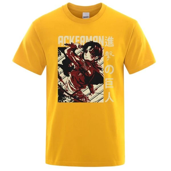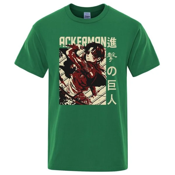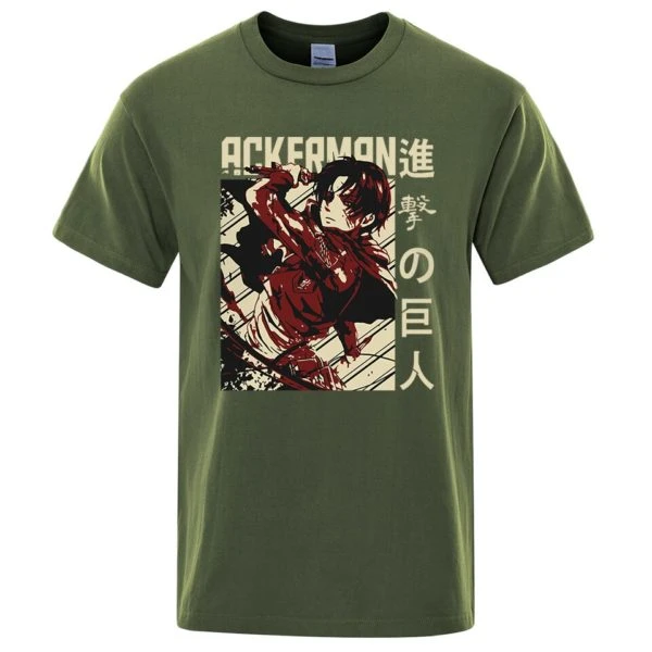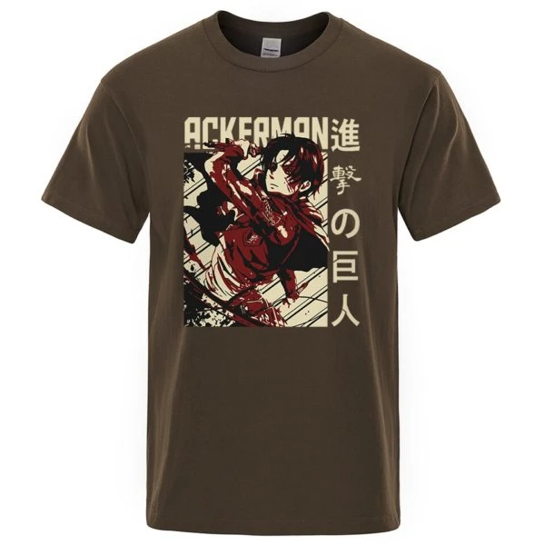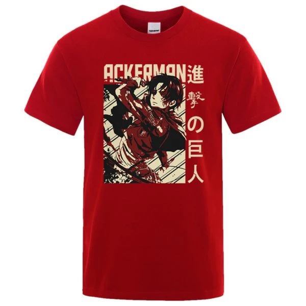 L’image représente le caporal Livaï en plein combat, en nuance de noir et rouge sur fond beige. Au-dessus de l’image est écrit Ackerman et sur le côté Shingeki No Kyojin en japonais, traduit par l’Attaque des Titans en français.