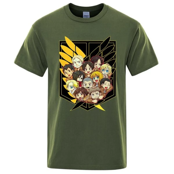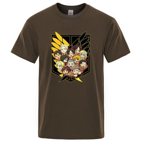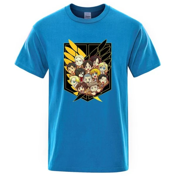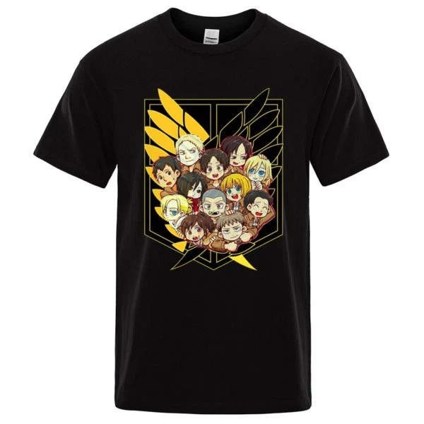 On retrouve sur l’image les principaux personnages de SNK dans un style kawaii. Dans le fond apparait l’emblème du Bataillon d’exploration en jaune et noir.