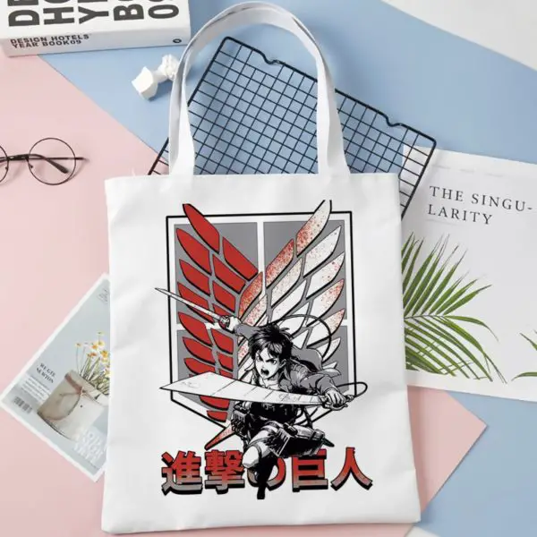 Ce Tote Bag de l’Attaque des Titan représente Eren se jetant à l’attaque, épées aux mains. L’Attaque des Titans est écrite en japonais en dégradé rouge à gris. Ces mêmes couleurs sont reprises pour les ailes de la liberté en fond, emblème du Bataillon d’exploration auquel appartient Eren.