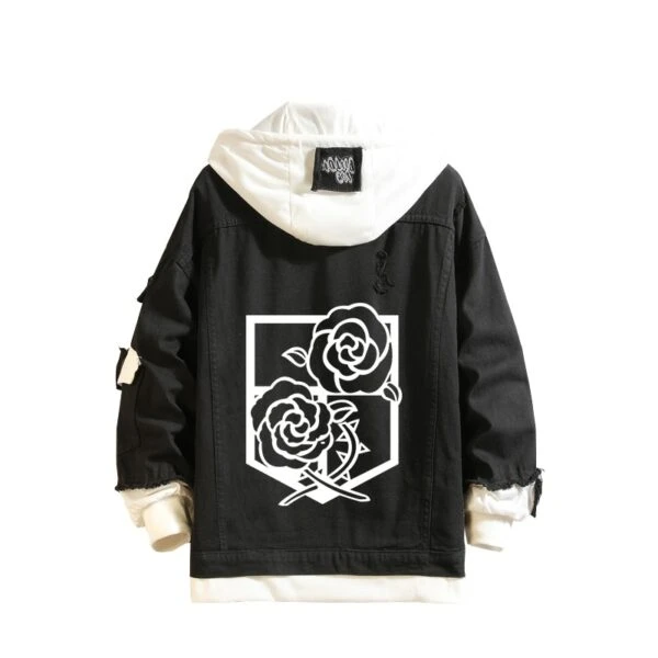 Veste en jean noir unisexe. Le denim est léger, rendant ce blouson idéal à porter en mi-saison. Coupe loose pour un style décontracté, avec une capuche, le bout des manches et l’élastique du bas de la veste en blanc.