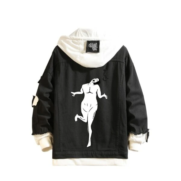 Veste en jean noir unisexe. Le denim est léger, rendant ce blouson idéal à porter en mi-saison. Coupe loose pour un style décontracté, avec une capuche, le bout des manches et l’élastique du bas de la veste en blanc.